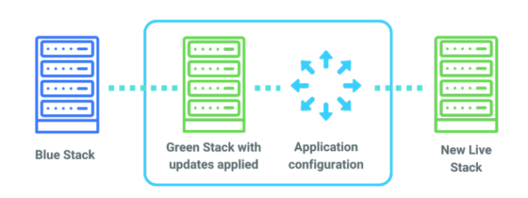 Applies updates to a replaceable “green” stack while the “blue” stack remains live.